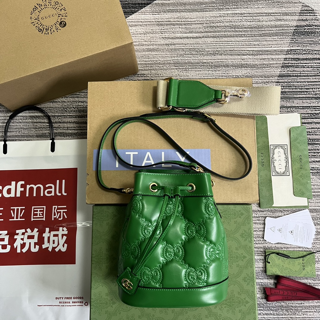 【Comes with full boutique green packaging】‼️ The GG matelassé leather mini bucket bag UM8HG continues to stand out in a unique way. With its ultra-soft finish, the iconic material is once again reimagined as part of the Gucci Love Parade, featuring textured geometric patterns. The design presents a contemporary approach to the logo trend of the 90s, which appears in the House’s latest collection. Here, it appears in a minimalist black shade. Black GG matelassé leather with gold hardware double G. Model number: 728231. Dimensions: 17*20*10cm. Color: Green/Embossed G original leather.