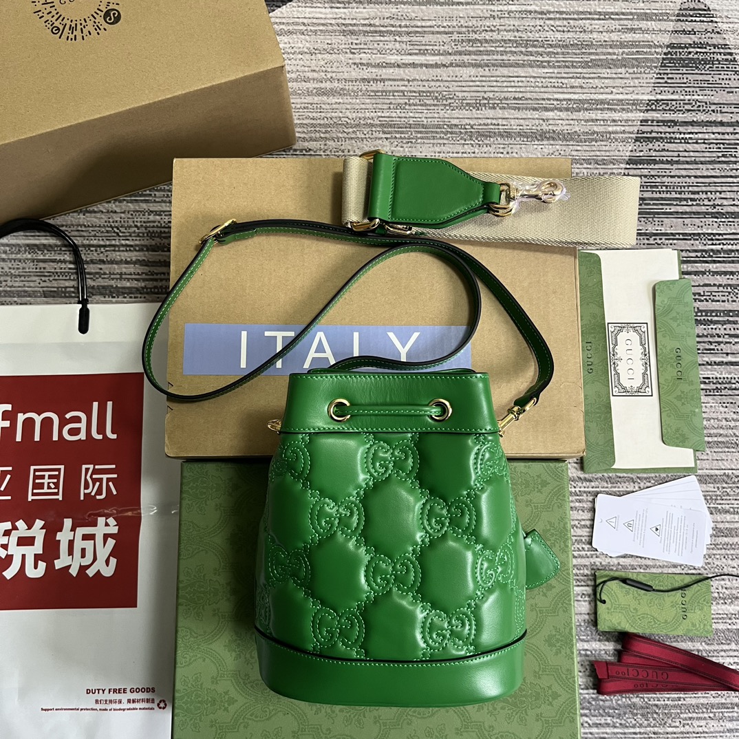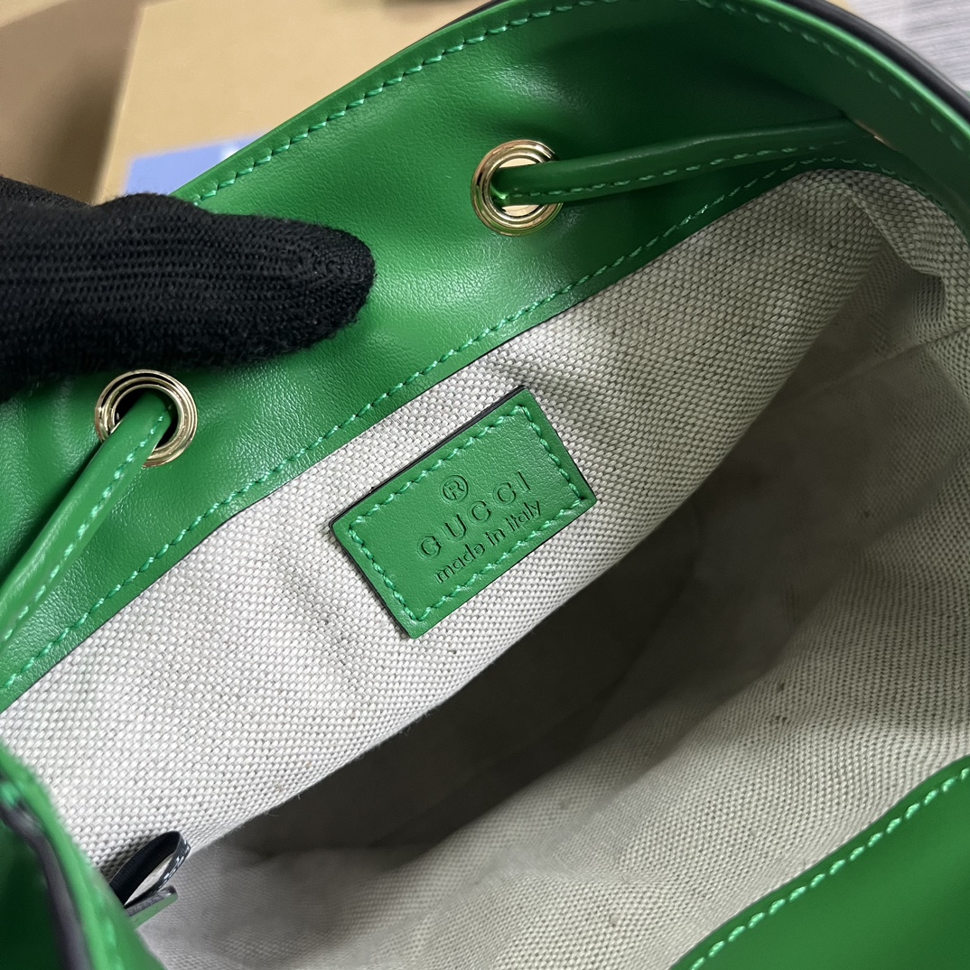 【Comes with full boutique green packaging】‼️ The GG matelassé leather mini bucket bag UM8HG continues to stand out in a unique way. With its ultra-soft finish, the iconic material is once again reimagined as part of the Gucci Love Parade, featuring textured geometric patterns. The design presents a contemporary approach to the 90s logo trend, which appears in the House’s latest collection. Here, it appears in a minimalist black shade. Black GG matelassé leather with gold hardware double G. Model: 728231. Size: 17*20*10cm. Color: Green/Embossed G original leather.