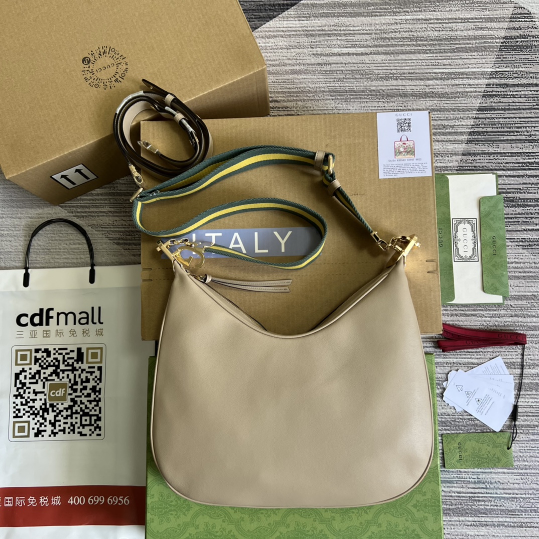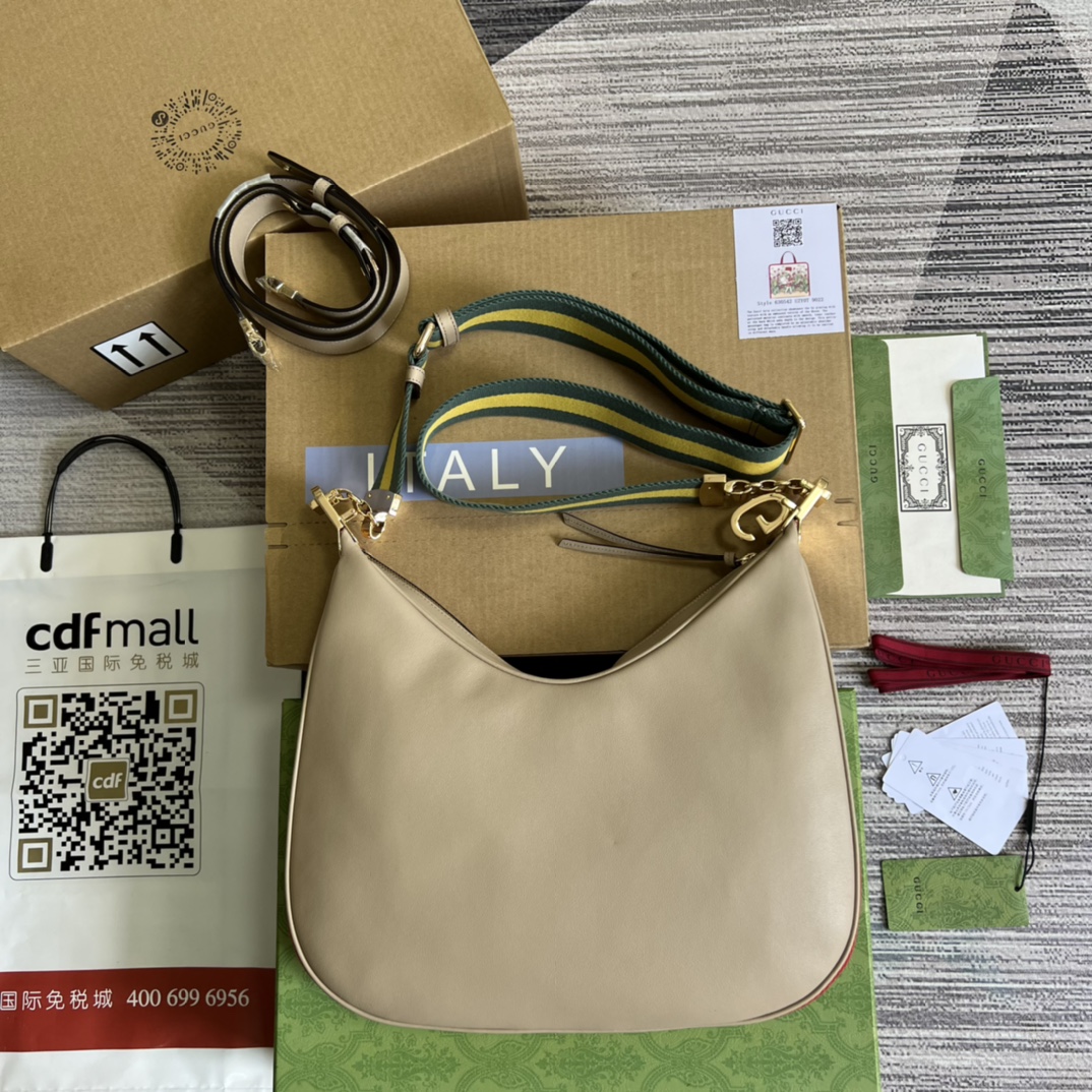 【Comes with full boutique green packaging】‼️GG👉Gucci Attache Large Shoulder Bag. The “Gucci March of Love” series reinterprets iconic Gucci elements, paying homage to the enduring charm of Hollywood. This accessory features a distinctive crescent shape, with a G hook adding a unique design aesthetic. Classic hardware combined with soft materials delivers a refined and romantic vintage appeal. This large shoulder bag is crafted from beige and blue GG Supreme canvas, trimmed with red and blue webbing. Beige and blue GG Supreme canvas, red and blue webbing trim, cotton-linen lining, leather shoulder strap, interior: 1 zip pocket, detachable webbing shoulder strap (50cm high), G hook with zipper. Model: 702823. Dimensions: 35 (W) x 32 (H) x 6cm (D). Color: Khaki original leather.