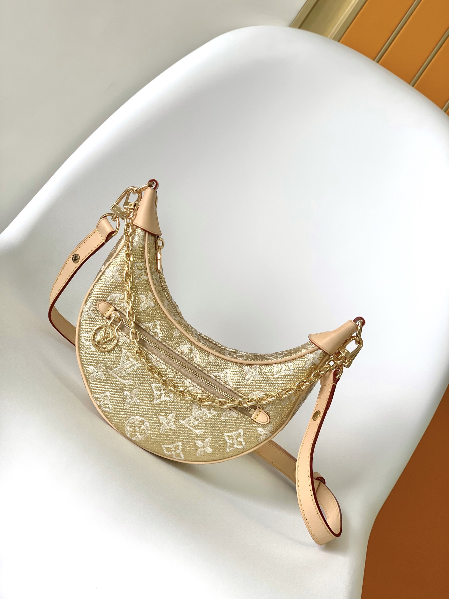 The top-tier M22928 Loop baguette bag is crafted from monoglam jacquard canvas, featuring a stylish and sleek design. A delicate chain and the LV Circle logo zipper pull on the front pocket exude charm. The bag’s coated exterior creates a soft metallic sheen, radiating a captivating iridescent sheen.