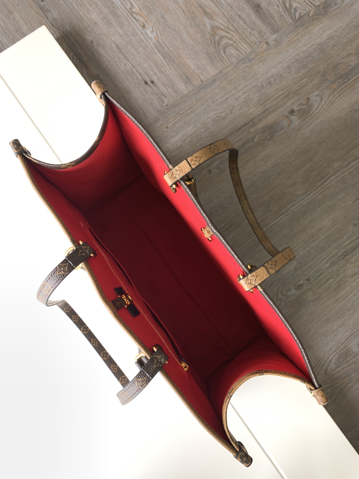 The M44576Onthego handbag is strikingly beautiful against the backdrop of Monogram Giant canvas, with Monogram Reverse patterns adorning the sides and handles, offering a glimpse into the variations in color and texture within a similar style. Its large size provides ample space, and the shoulder strap and Toron handles make it perfect for everyday use. Detailed features: 41.0 x 34.0 x 19.0 cm (Length x Height x Width) Monogram and Monogram Reverse coated canvas Monogram Reverse trim Microfiber lining 2 Toron handles 2 shoulder straps Zippered patch pockets Double interior pockets