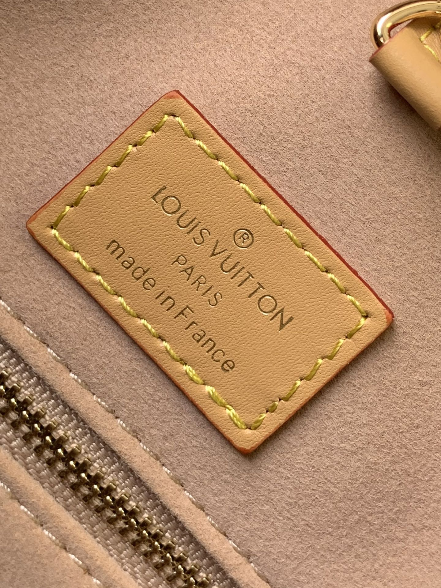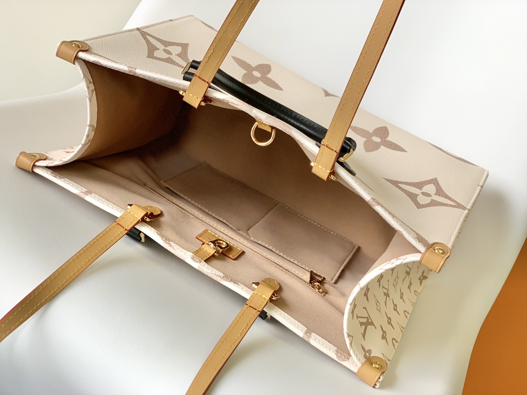 The M46912 top-tier OnTheGo medium tote bag features the Monogram pattern, first printed and then embossed onto soft grained cowhide. It’s a two-tone colorway with a large floral print on white, black, and yellow leather, perfect for a diaper bag. Its spacious interior can hold a laptop and other office supplies, and the various handles allow for easy hand-carrying or shoulder carrying. Dimensions: 34.0 x 26.0 x 13.0 cm. 110% J465560