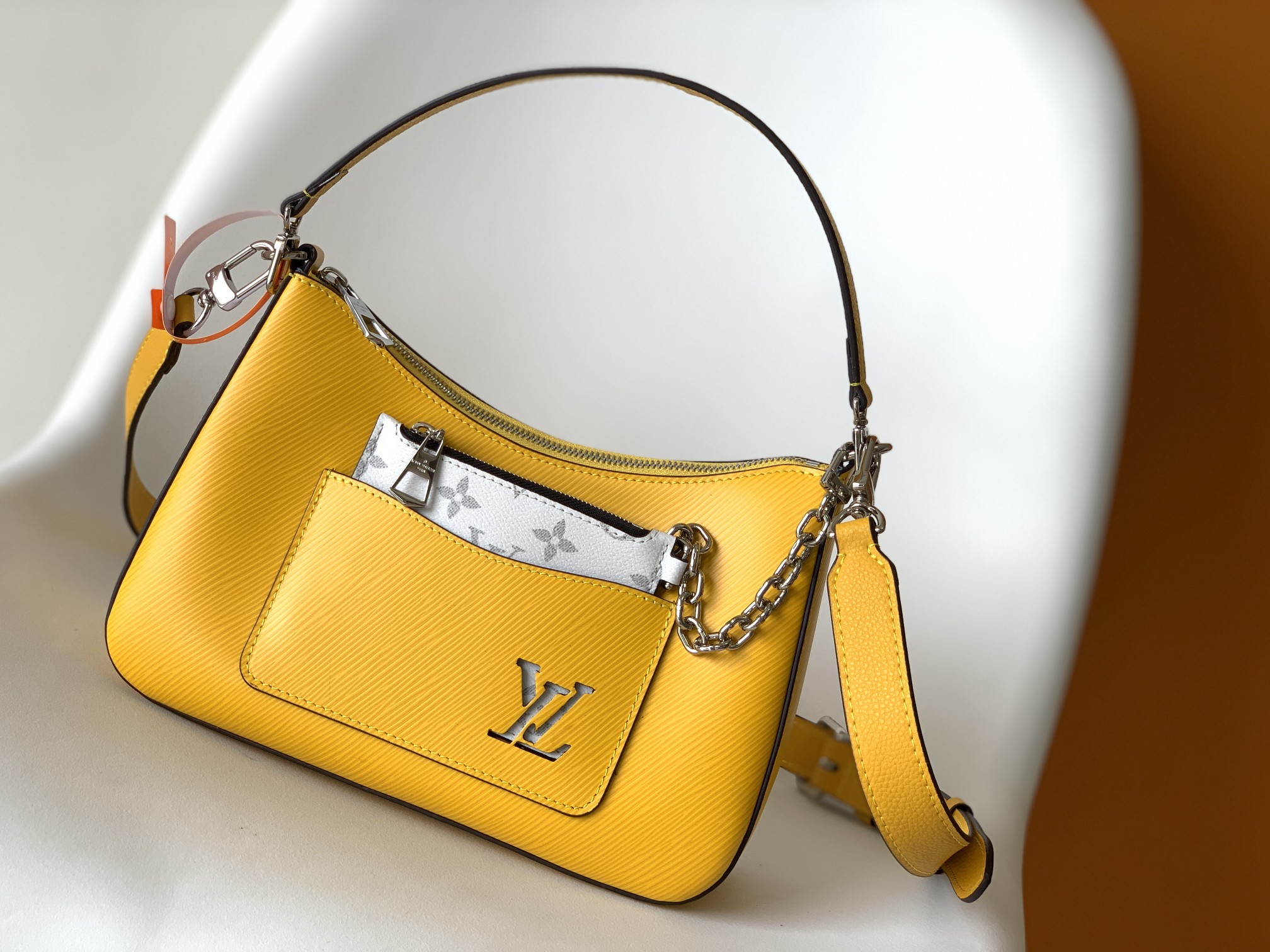 Top-grain leather [Exclusive Real Shots 59486 Blue M59488 Yellow M80688 White M80689 Black M80794 Caramel Marelle Handbag] This handbag is crafted from Epi grain leather and features a detachable canvas chain pocket secured to the exterior. It can be carried by hand, on the elbow, over the shoulder, or crossbody with the top handle or adjustable shoulder strap. Detailed features: 25 x 15 x 8 cm (Length x Height x Width)