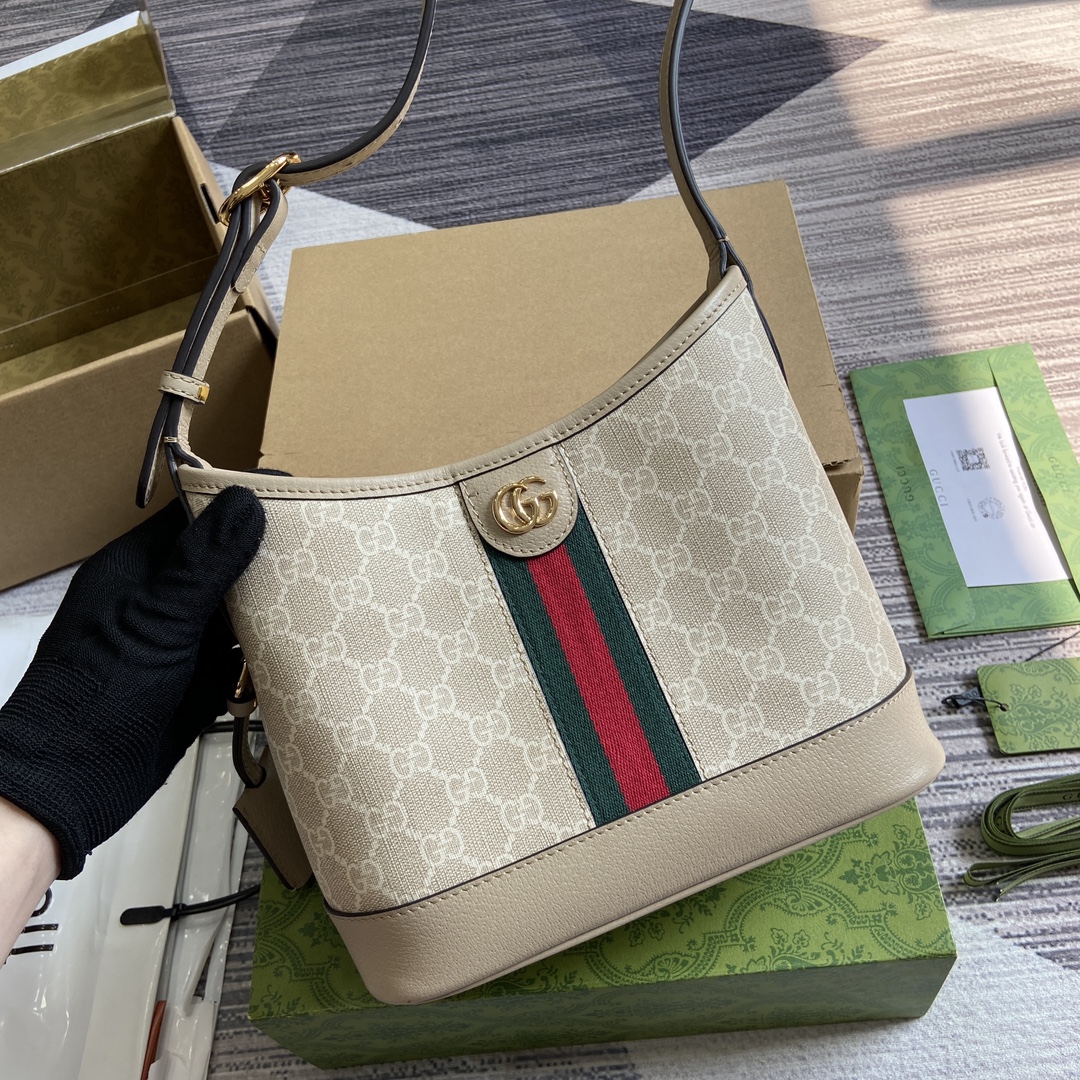 (Comes with full packaging)‼️ This small shoulder bag offers a fresh take on the Ophidia collection with its ingenious design, seamlessly blending an open bucket bag with a shoulder bag style. It’s crafted from the brand’s signature beige and ebony GG Supreme canvas. Model: 781402. Dimensions: 23*21*12cm. Color: Oatmeal PVC.